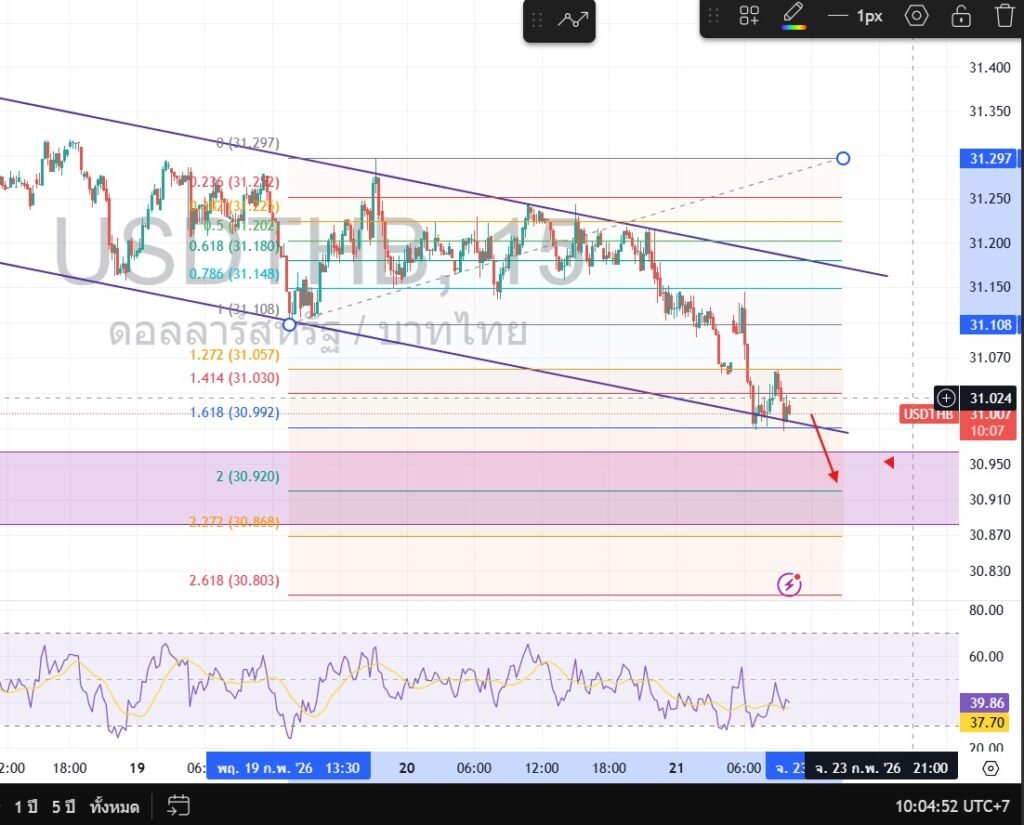 Technical Outlook: The technical trend remains bearish, continuing the downward momentum from last Friday. Current resistance is spotted at 31.15, while the previous support at 30.92 has been tested. With the RSI staying in the selling zone, the pair is expected to decline further today toward the identified target levels. ในทางเทคนิค ทิศทางราคายังคงเป็นขาลงต่อเนื่องมาตั้งแต่ศุกร์ที่ผ่านมา โดยมีแนวต้านปัจจุบันอยู่ที่ 31.15 และแนวรับเก่าอยู่ที่ 30.92 ขณะที่ RSI ยังคงอยู่ในโซนขาย (Oversold) คาดการณ์ว่าราคาจะปรับตัวลดลงต่อในวันนี้เพื่อทดสอบแนวรับด้านล่าง