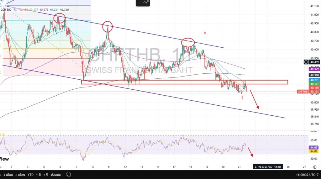 Market Analysis: The Swiss Franc has been in a steady decline against the Baht since early February. The massive selling pressure follows a major technical breakdown, and the pair lacks any significant reversal signals at this stage. เงินสวิสเซสยังคงเป็นขาลงต่อเนื่องมาตั้งแต่ต้นเดือนกุมภาพันธ์ โดยได้รับแรงกดดันจากแรงเทขายอย่างหนักหลังจากหลุดระดับสำคัญ และในปัจจุบันยังไม่พบสัญญาณการกลับตัวที่ชัดเจน