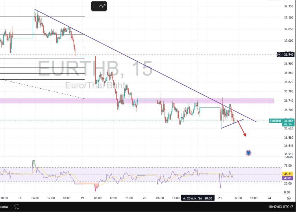 Technical Outlook: The trend line clearly indicates a bearish trajectory. Although the RSI rebounded once from the Oversold territory, it failed to break above the 36.75 resistance. There is a high risk of continued downside if the price breaks below the 36.63 zone. เทรนด์ไลน์แสดงทิศทางขาลงที่ชัดเจน แม้ RSI จะมีการรีบาวด์ขึ้นมาจากเขต Oversold หนึ่งครั้ง แต่ยังไม่สามารถเบรกผ่านแนวต้าน 36.75 ไปได้ จึงยังมองเป็นความเสี่ยงขาลง หากภายในวันราคาหลุดโซน 36.63 แนะนำให้ขายเนื่องจากจะไหลลงต่อเนื่อง