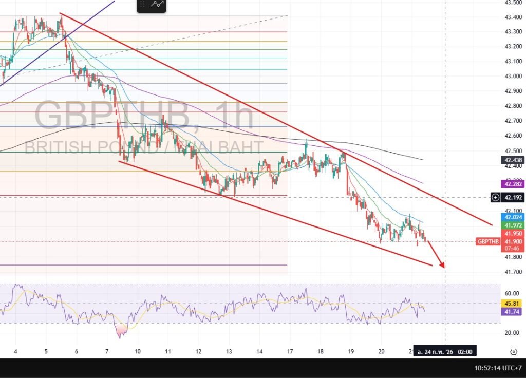 Market Analysis: The Pound remains under pressure as recent PMI data (50-51) barely crossed the expansion threshold and fell short of market expectations. Furthermore, the high probability of future interest rate cuts by the BoE makes holding GBP less attractive compared to the strengthening Baht. ค่าเงินปอนด์ยังมีแนวโน้มปรับตัวลงต่อ เนื่องจากดัชนี PMI ล่าสุดอยู่ที่ 50-51 แม้จะดีขึ้นเล็กน้อยแต่ยังต่ำกว่าที่ตลาดคาดหวัง ประกอบกับแนวโน้มที่ธนาคารกลางอังกฤษอาจลดดอกเบี้ยในอนาคต ทำให้ความน่าสนใจในการถือครอง GBP ลดลง
