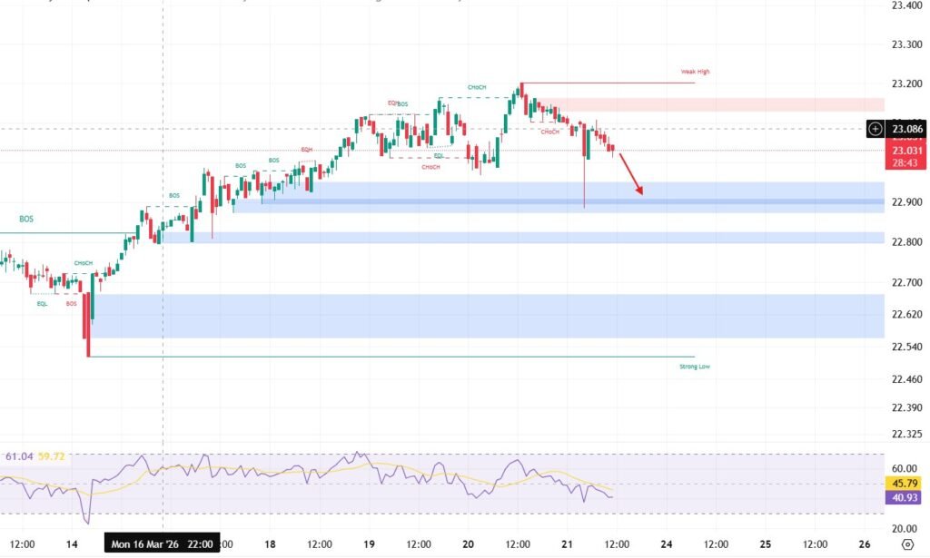 Technical Outlook: The price peaked at 23.20, narrowly missing the 23.23 target, before facing rejection at resistance. The pair is currently in a sideways consolidation phase within the 23.20 – 22.90 range. A test of the lower boundary at 22.90 is expected.