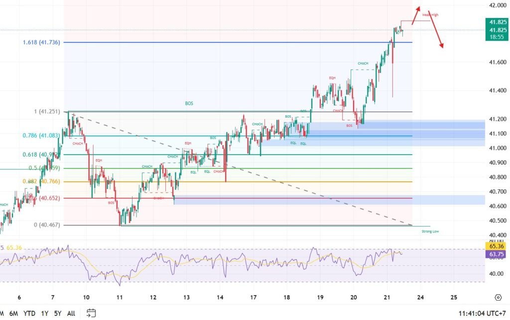 Technical Outlook: The price reached the target of 41.73 and successfully broke out. The next projection is the 200% Fibonacci extension at the 42.00 zone. Traders should watch for potential profit-taking at this major psychological resistance. ราคาปรับตัวถึงเป้าหมายที่ 41.73 และสามารถเบรกเอาท์ไปได้ คาดว่าราคาจะขยับขึ้นไปทดสอบระดับ 200% Fibo บริเวณโซน 42.00 ซึ่งอาจเริ่มเห็นแรงเทขายทำกำไรบริเวณแนวต้านดังกล่าว