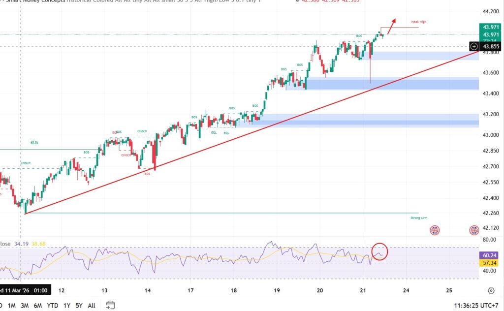 Technical Outlook: The price recently tested the 44.00 resistance and pulled back slightly. This is viewed as a short-term sell-off, as the RSI still indicates Bullish Momentum. If the price breaks above 44.00 again, the next target is projected at 44.15.