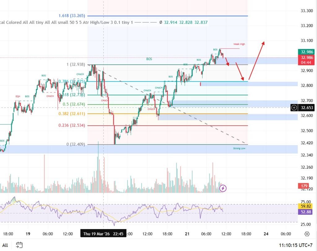 เช้านี้ราคาปรับตัวขึ้นแตะระดับ 33.00 โดยคาดว่าระหว่างวันอาจมีการย่อตัวเล็กน้อยเพื่อสะสมแรงไปต่อ โดยมีแนวรับสำคัญอยู่ที่ 32.94 และ 32.85 ทั้งนี้เมื่อวัดจาก Fibo มองเป้าหมายถัดไปที่ 33.265 คาดว่าหลังจากจบการย่อตัวมีโอกาสดีดตัวขึ้นต่อภายในสัปดาห์นี้