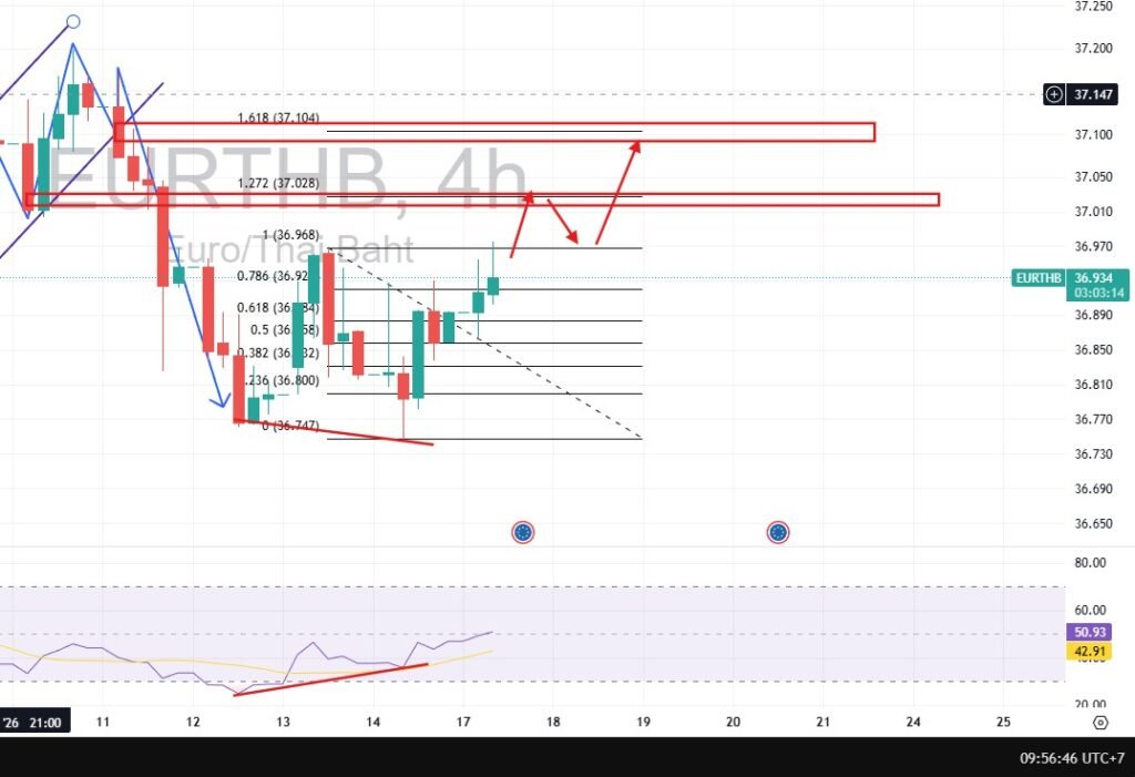Market Analysis: While the weakening Baht provides some support for EURTHB, the Euro itself remains under pressure. The EURUSD pair is trending lower, indicating that the Euro is currently weaker than the US Dollar. Furthermore, European 10-year bond yields have dropped to 2.75%, forming a “Double Top” pattern. However, if the Baht continues to weaken and the Euro begins to stabilize, we could see a strong upward rally in EURTHB this week.