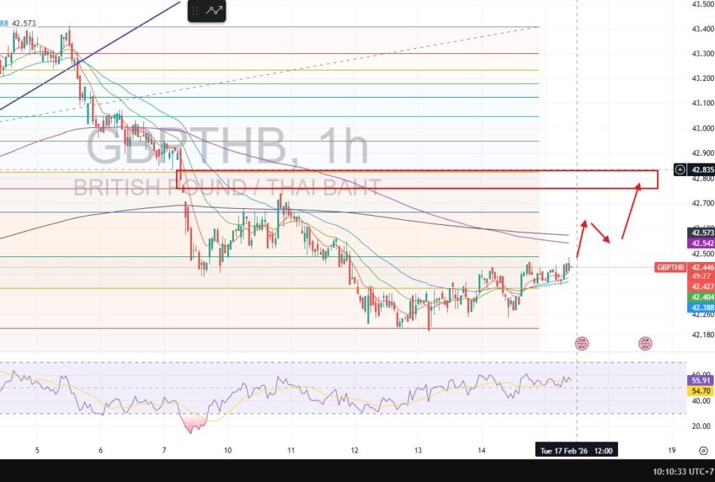 Market Analysis: The GBP/THB pair appears to have bottomed out at the 2x Fibonacci extension level, establishing a solid support base at 42.20. Despite thin buying volume in the short term, technical indicators suggest a recovery is underway. Market participants are closely watching the UK Unemployment Rate data released at 2:00 PM (GMT+7), which is expected to remain steady at 5.1%. Stability in the labor market could provide the necessary catalyst for the Pound to gain traction against the Baht.